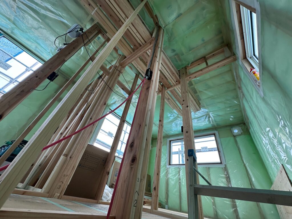 断熱材施工後、壁、天井全面に気密シートを張ります
